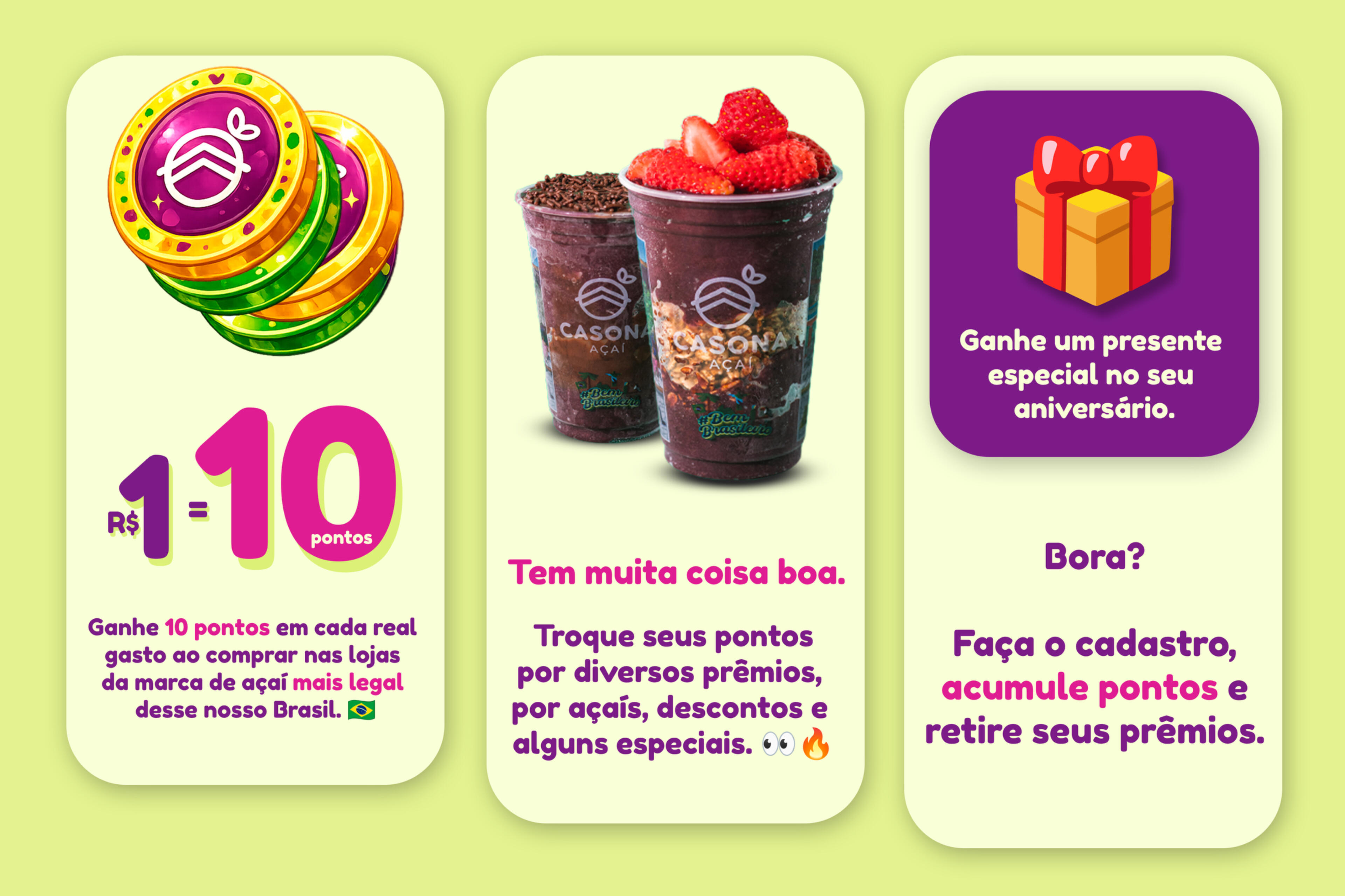 Você pode acumular pontos em mais de 25 lojas do Casona Açaî espalhadas por aÃ.